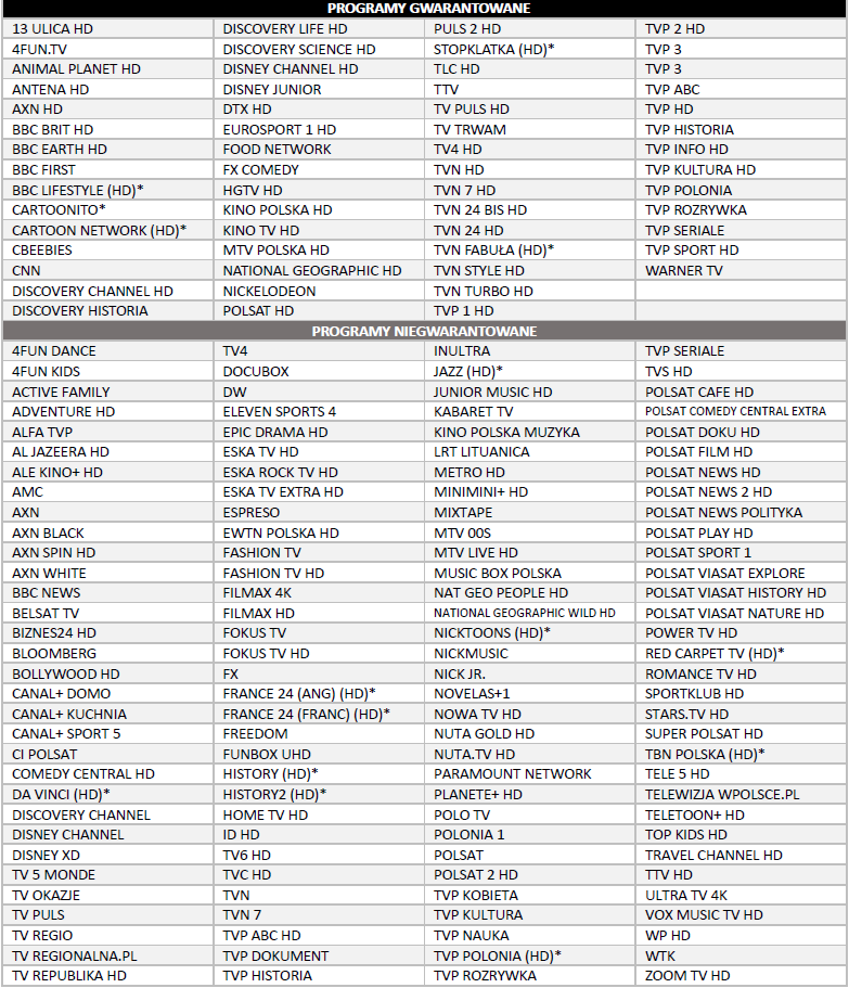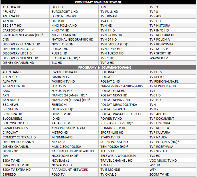 6. Programy gwarantowane zgodne z definicją zawartą w Regulaminie Świadczenia Usług. Włączenie i wyłączenie programu niegwarantowanego nie jest zmianą Umowy Abonenckiej i nie wymaga uprzedniego powiadomienia o tym Abonenta.